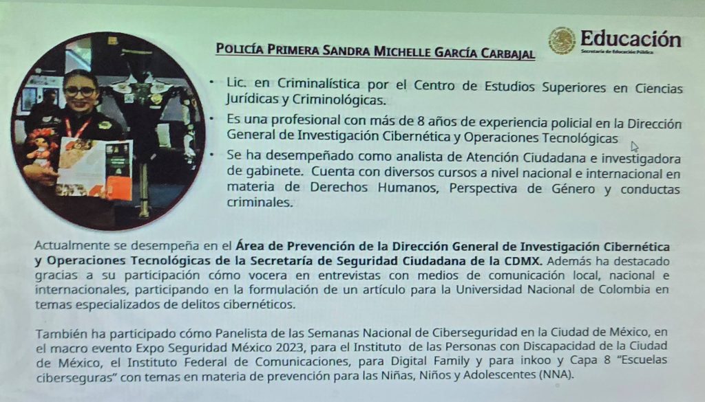 Su intervención en el ITG se suma a su participación como panelista en eventos como las Semanas Nacionales de Ciberseguridad, Expo Seguridad México 2023, y actividades organizadas por el Instituto de las Personas con Discapacidad de la Ciudad de México, el Instituto Federal de Comunicaciones, Digital Family, inkoo y Capa 8, abordando temas de prevención dirigidos a niñas, niños y adolescentes.